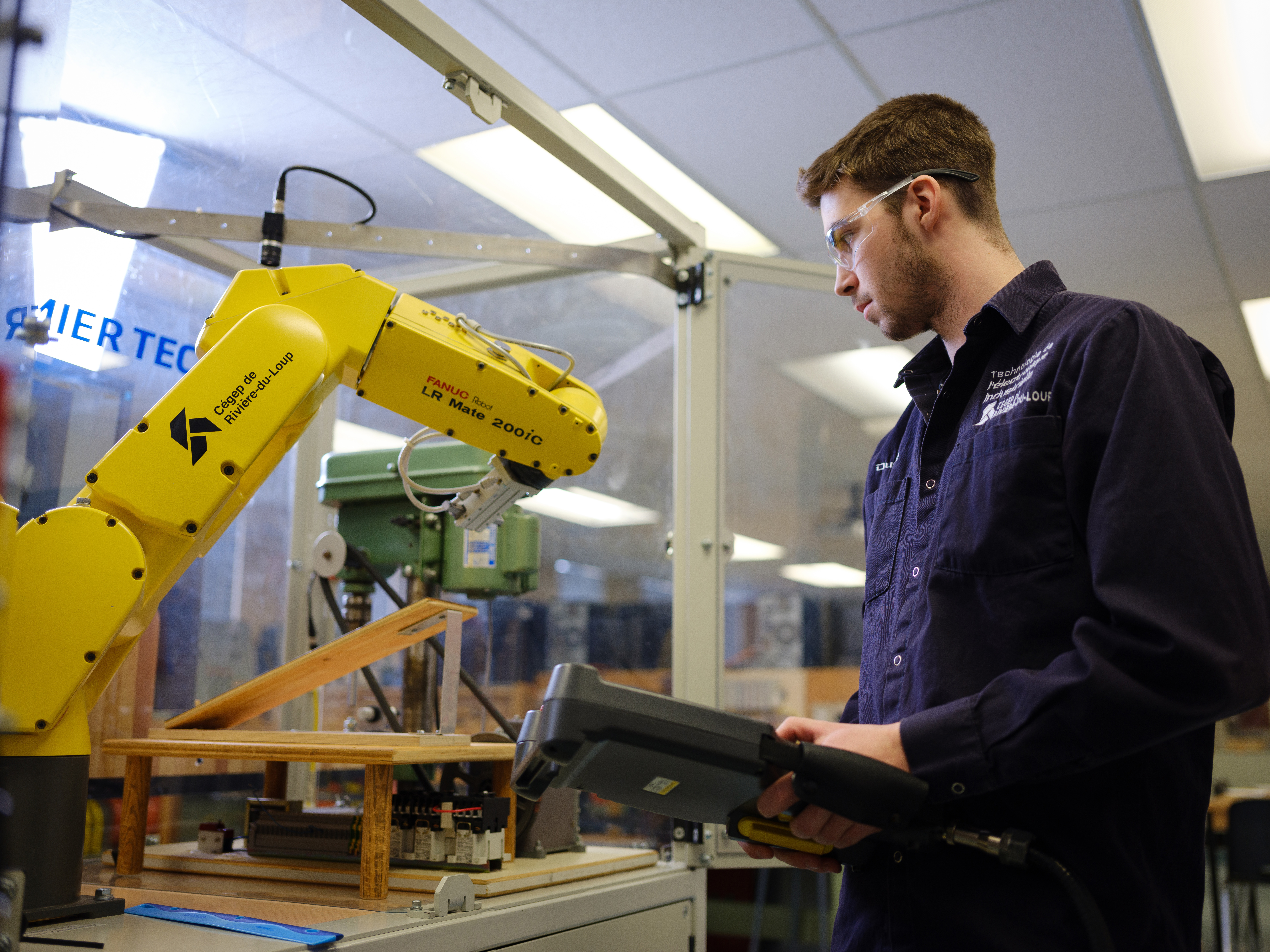 En Technologie du génie électrique - Automatisation et contrôle, tu développeras une expertise dans le contrôle de robots industriels. Tu auras l'impression de faire partie du robot! Tu deviendras spécialiste du fonctionnement et de l'automatisation des équipements industriels et des systèmes. D'ailleurs, les entreprises t'attendent déjà et tu auras un emploi assuré! On t'offrira même un programme en alternance travail-études, pour que tu puisses travailler et acquérir de l'expérience dans le domaine tout en étudiant. Imagine, travailler avec d'autres pros du domaine ainsi qu'avec des robots, des capteurs, des moteurs, et des systèmes informatiques de pointe! On t'attends en Technologie du génie électrique!