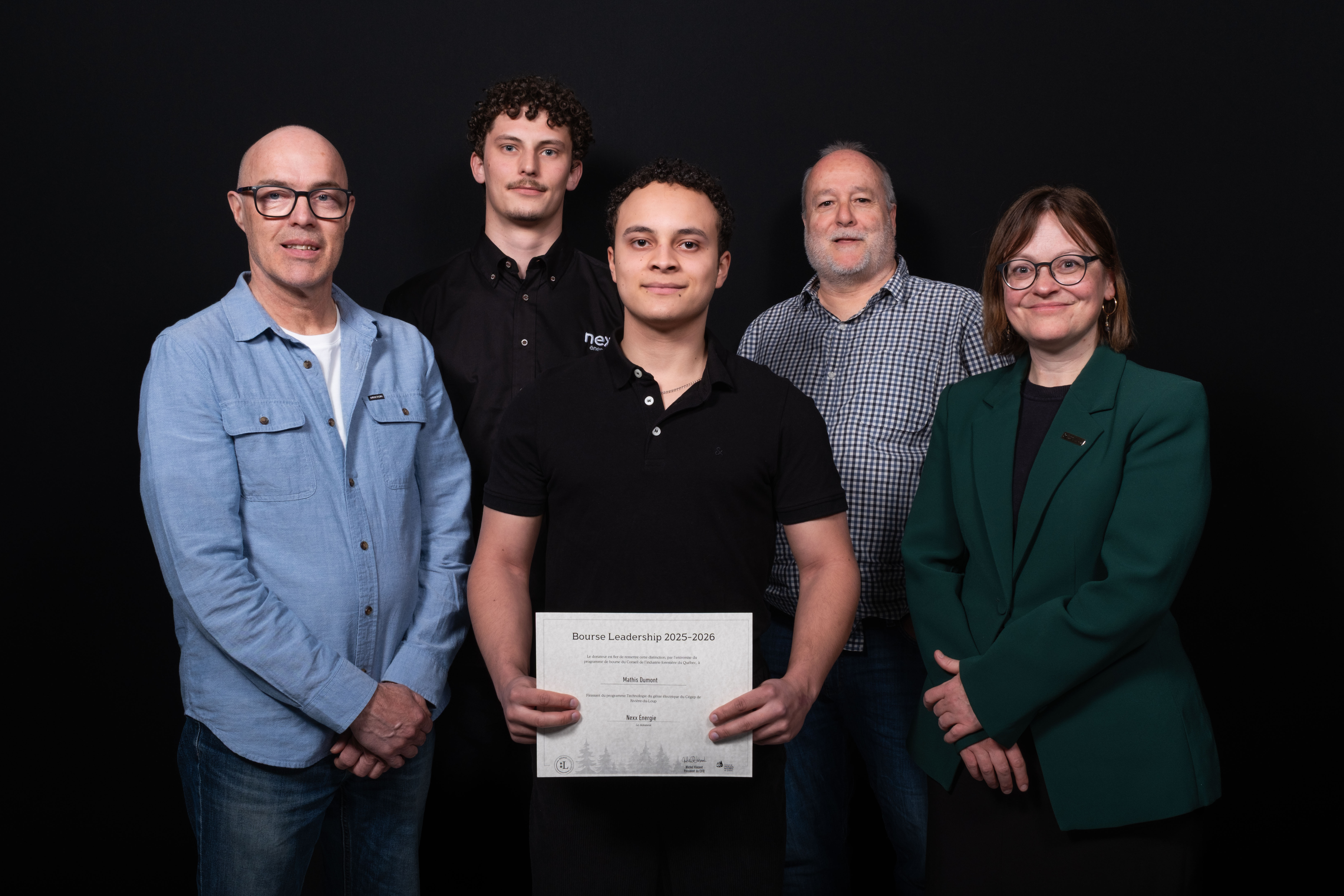 André Roy, enseignant responsable de la coordination départementale; Matéo Bonnet, de NEXX Énergie; Mathis Dumont, récipiendaire; Mario Michaud enseignant responsable de la coordination départementale; Nadia Morin, directrice adjointe des études, responsable du programme.